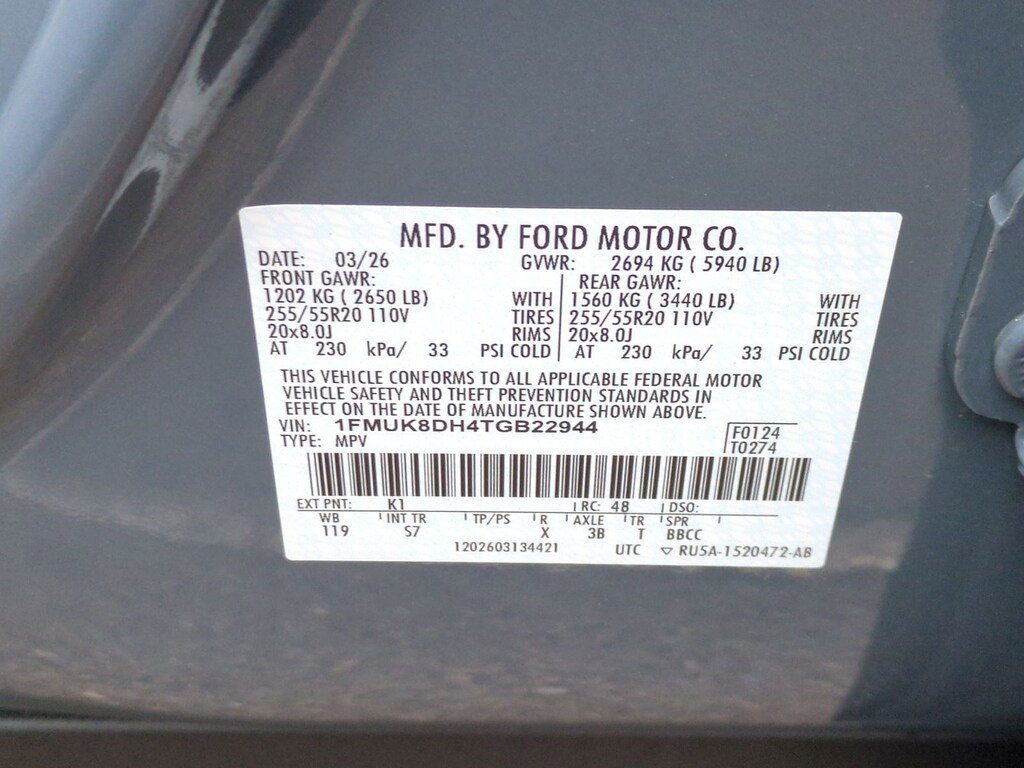 Vin Number: 1FMUK8DH4TGB22944