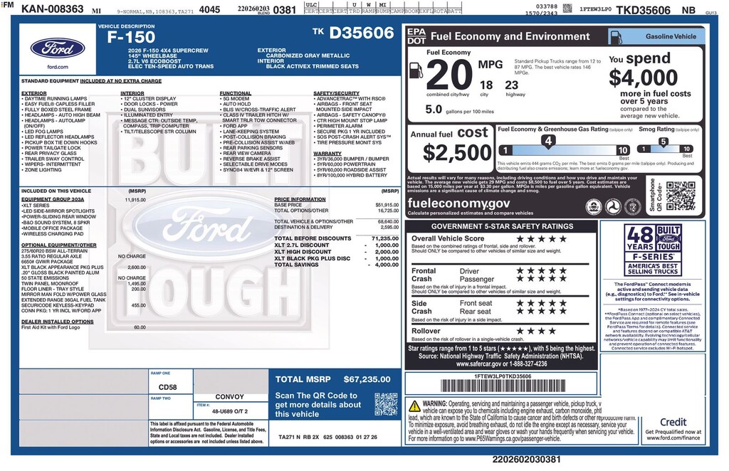 4WD. 4WD 2.7L V6 EcoBoost Price does not include licensing costs, registration fees, taxes and dealer doc fee of $280, which are to be paid by the consumer. Price includes A-Z Plan rebate qualifications unless otherwise indicated. See Sales staff for details.$2000 - Retail Customer Cash. Exp. 03/31/2026
